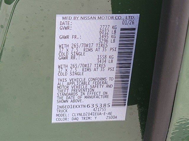 * We offer the most competitive pricing in Northern Colorado and the highest customer satisfaction.*. Inventory available @ the dealership now! Serving the greater Northern Colorado and Denver area, including Fort Collins, Greeley, Loveland, Highlands Ranch, Broomfield, Longmont, Boulder, Parker, and Thornton. Tactical Green Metallic 2026 Nissan Frontier PRO-4X 4WD 9-Speed Automatic with Overdrive 3.8L DI DOHC 24V V6 4WD.